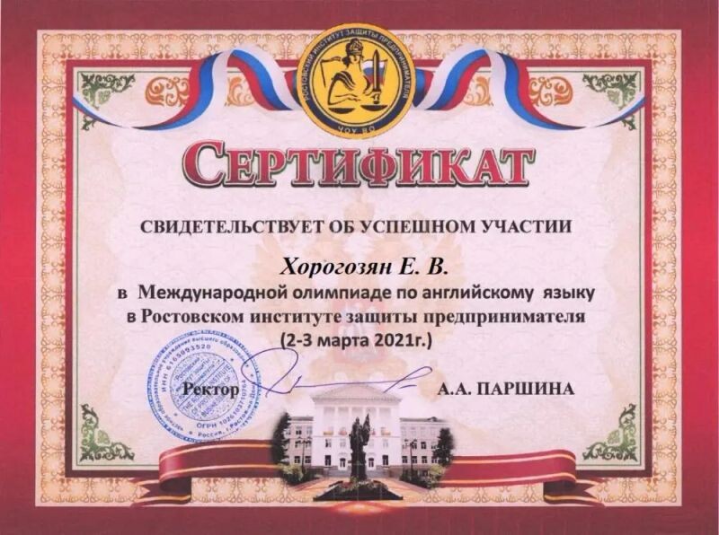 - Сертификат об участии в международной олимпиаде по английскому языку, 2021 г.