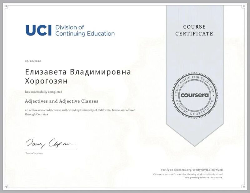 - University of California (Irvine), Adjectives and Adjective Clauses (на платформе Coursera), 2020 г.
