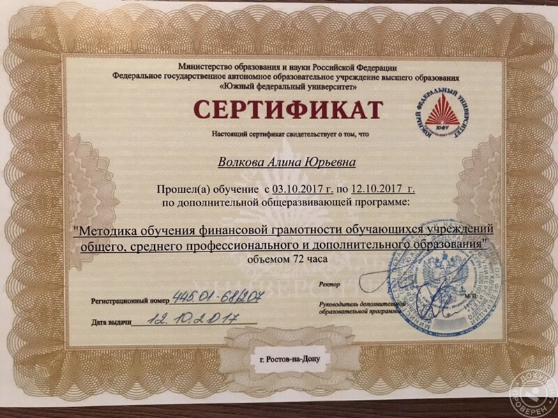 - Сертификат «Методика обучения финансовой грамотности обучающихся учреждений общего, среднего профессионального и дополнительного образования» (2017 г.).
