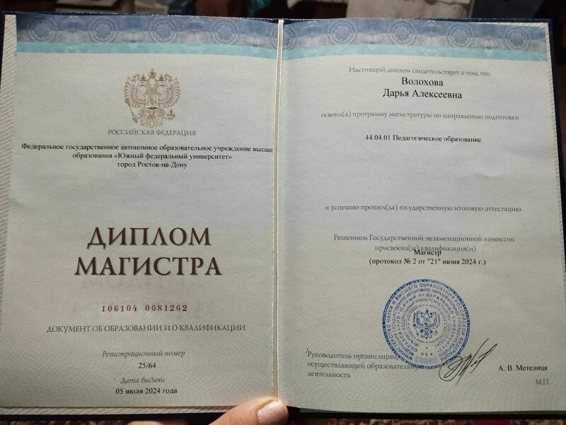 - ЮФУ, педагогическое образование, магистр, 2022–2024 гг.