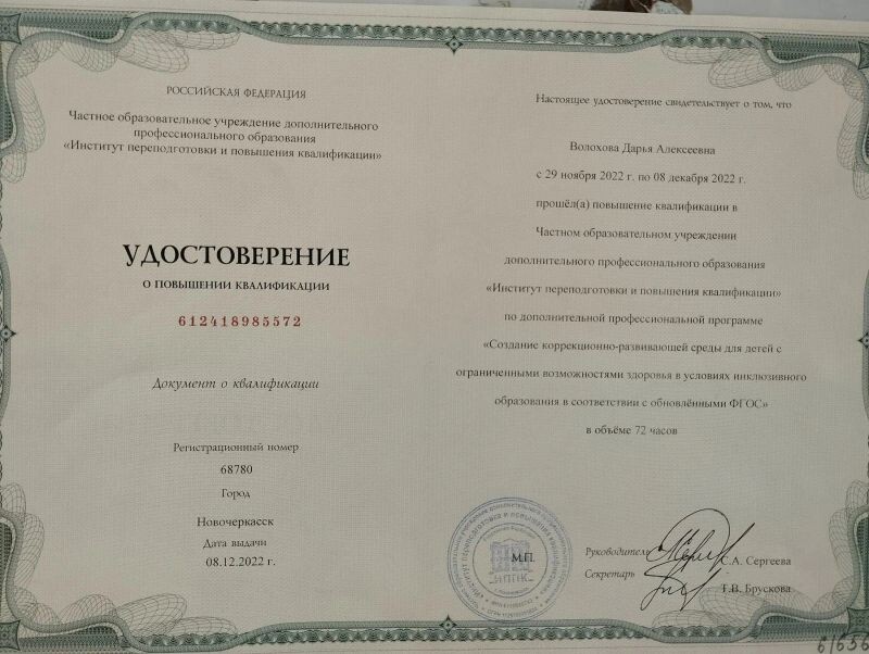 - Институт переподготовки и повышения квалификации, создание коррекционно-развивающей среды для детей с ограниченными возможностями здоровья в условиях инклюзивного образования в соответствии с обновлёнными ФГОС, 2022 г.