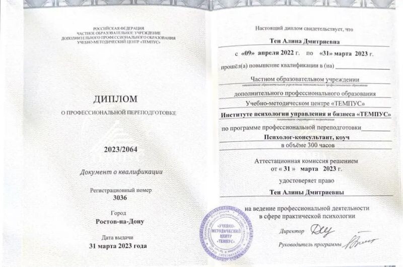 - Институт психологии управления и бизнеса «ТЕМПУС», психолог-консультант, коуч, 2022–2023 гг.