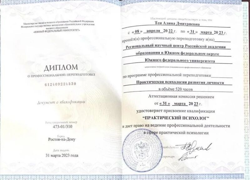 - Региональный научный центр Российской академии образования в Южном федеральном округе Южного федерального университета, практическая психология развития личности, 2022–2023 гг.