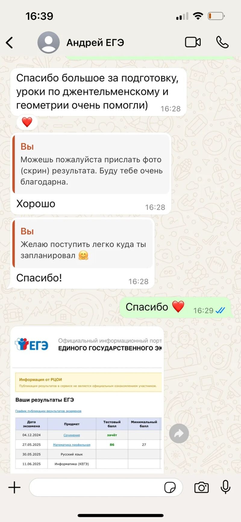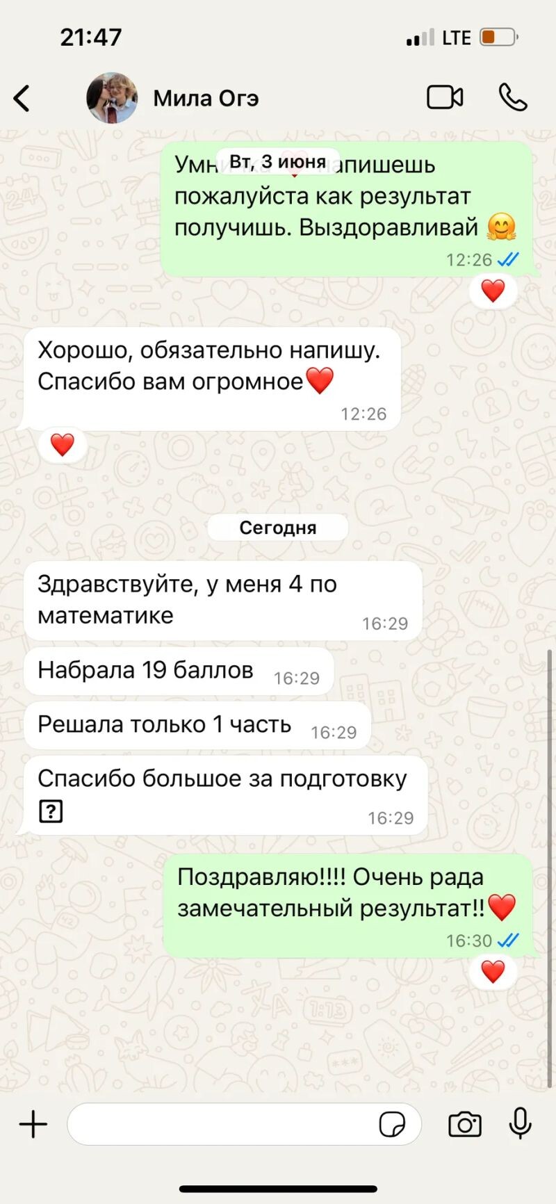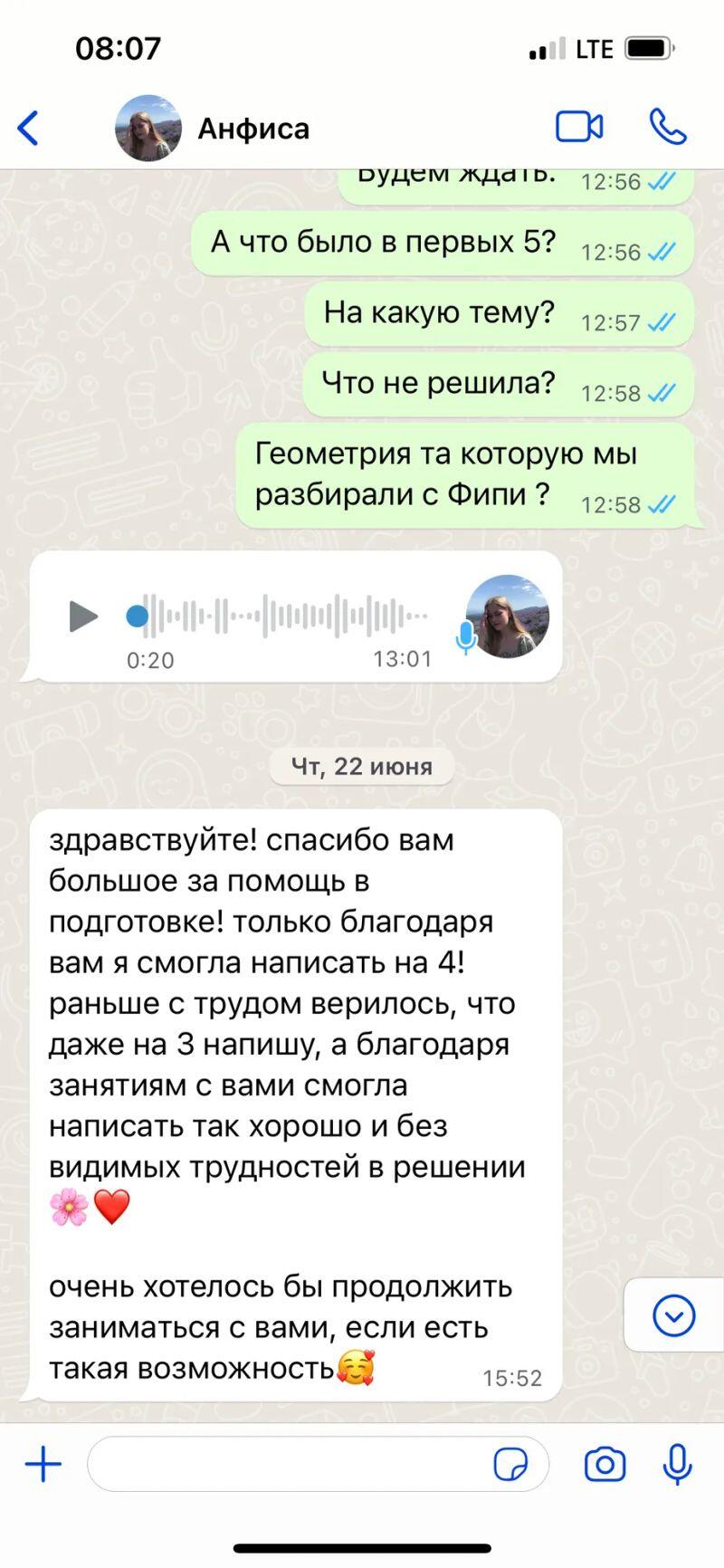 Отличный педагог. Понравилось,что урок начинается вовремя без всяких переносов на "пять минуточек". Объясняет всё по делу: кратко, чётко, доходчиво. Ребёнок в восторге. Я в восторге. Надеюсь теперь к экзаменам всё будет в порядке.
