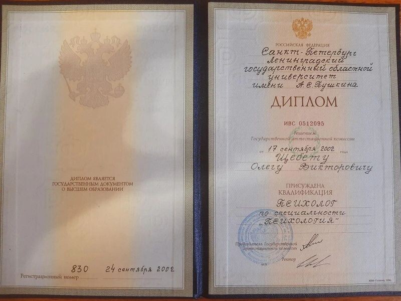 - Ленинградский областной университет им. А.С. Пушкина, психолог, 1998–2002 гг.