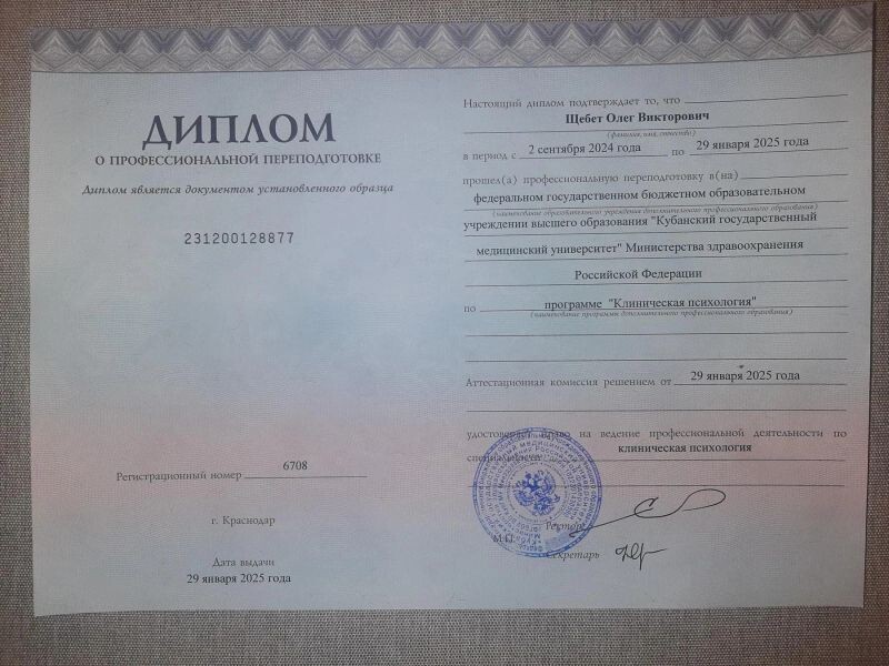 - Кубанский государственный медицинский университет Министерства здравоохранения Российской Федерации, клиническая психология, 2024–2025 гг.