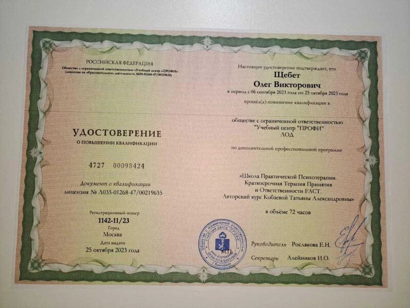 - Учебный центр «ПРОФИ», программа «Школа практической психотерапии. Краткосрочная терапия принятия и ответственности FACT. Авторский курс Кобзевой Татьяны Александровны», 72 часа, 2023 г.