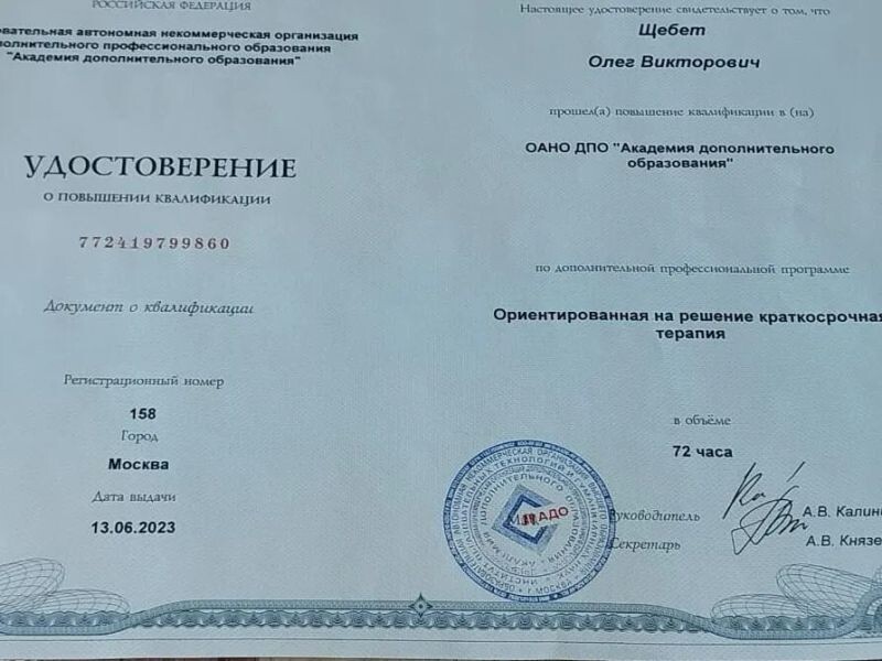 - Академия дополнительного образования, программа «Ориентированная на решение краткосрочная терапия», 2023 г.