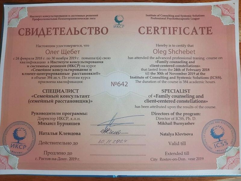 - Институт консультирования и системных решений, системная семейная терапия, 192 часов, 2017–2019 гг.