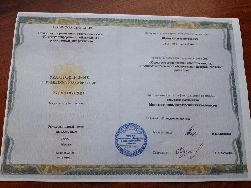 - Институт непрерывного образования и профессионального развития, программа «Медиатор: навыки разрешения конфликтов», 2023 г.