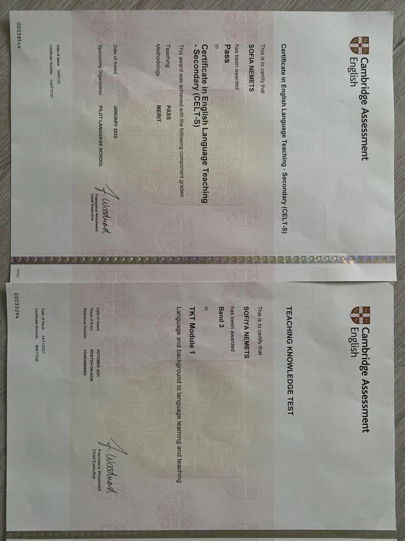 - Кембриджские сертификаты: TKT (2021 г.), CELT-S (2022г.).