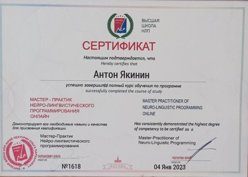- Высшая школа НЛП, мастер-практик нейролингвистического программирования онлайн, 2023 г.