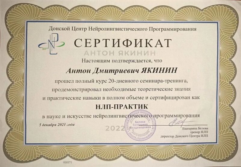 - Донской центр нейролингвистического программирования, курс «НЛП-практик», 2021 г.