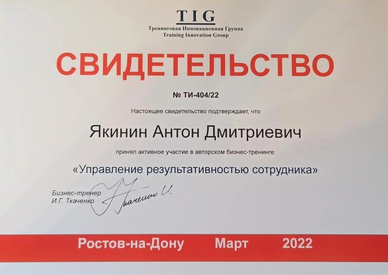 - Тренинговая инновационная группа, участие в авторском бизнес-тренинге «Управление результативностью сотрудника», 2022 г.