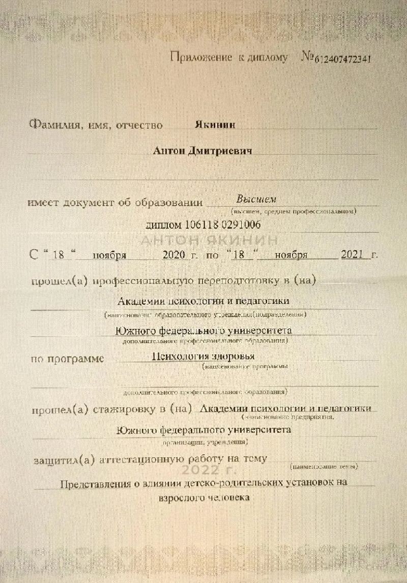 - Южный федеральный университет, профессиональная переподготовка, программа «Психология здоровья», 2020–2021 гг.