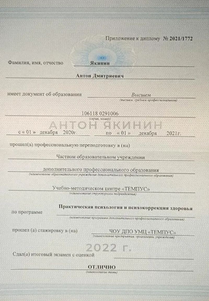 - УМЦ «ТЕМПУС», профессиональная переподготовка, программа «Практическая психология и психокоррекция здоровья», 2020–2021 гг.