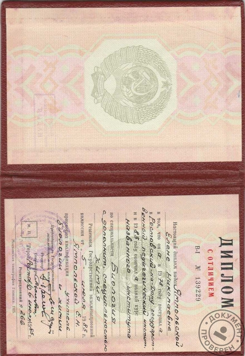 - Ростовский-на-Дону государственный педагогический институт, факультет биологии и химии, специальность – биология с дополнительной специальностью химия, 1983 г.