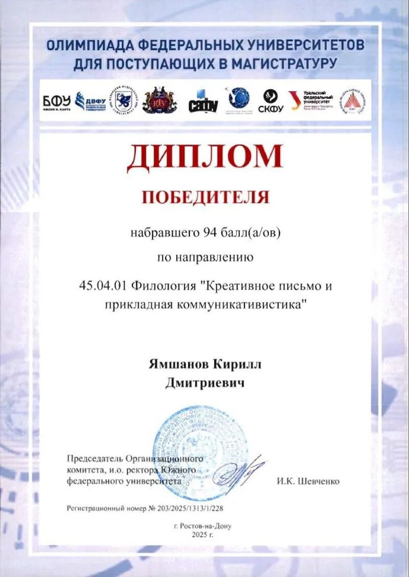 - ЮФУ (Южный Федеральный Университет), ИФЖиМКК, отечественная филология (с 2021 г.).