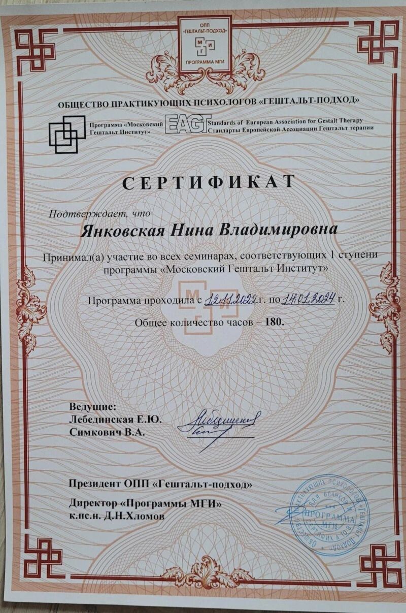 - ОПП «Гештальт-подход», МГИ, программа подготовки гештальт-терапевтов, 1 ступень, 2022–2024 гг.