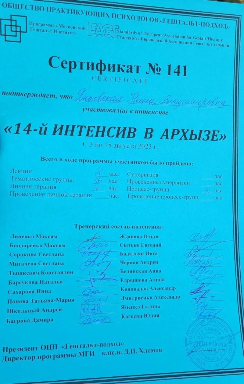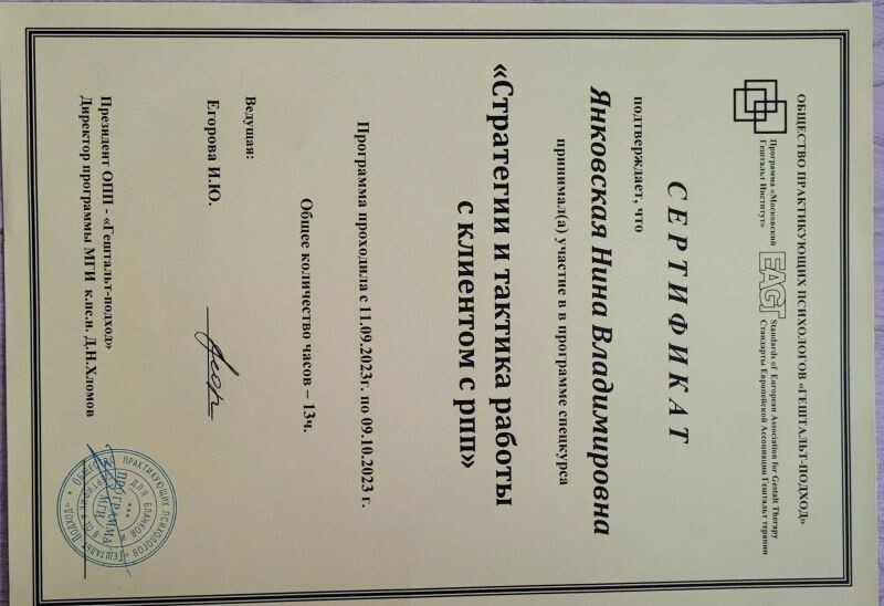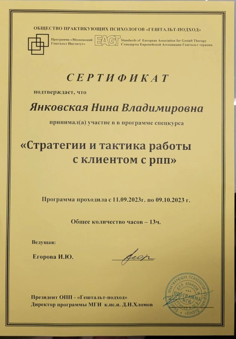 - ОПП «Гештальт-подход», МГИ, программа «Стратегии и тактика работы с клиентом с РПП», 2023 г.