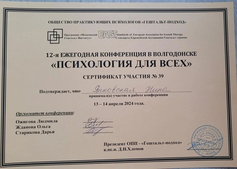 - ОПП «Гештальт-подход», XII ежегодная конференция в Волгодонске «Психология для всех», 2024 г.