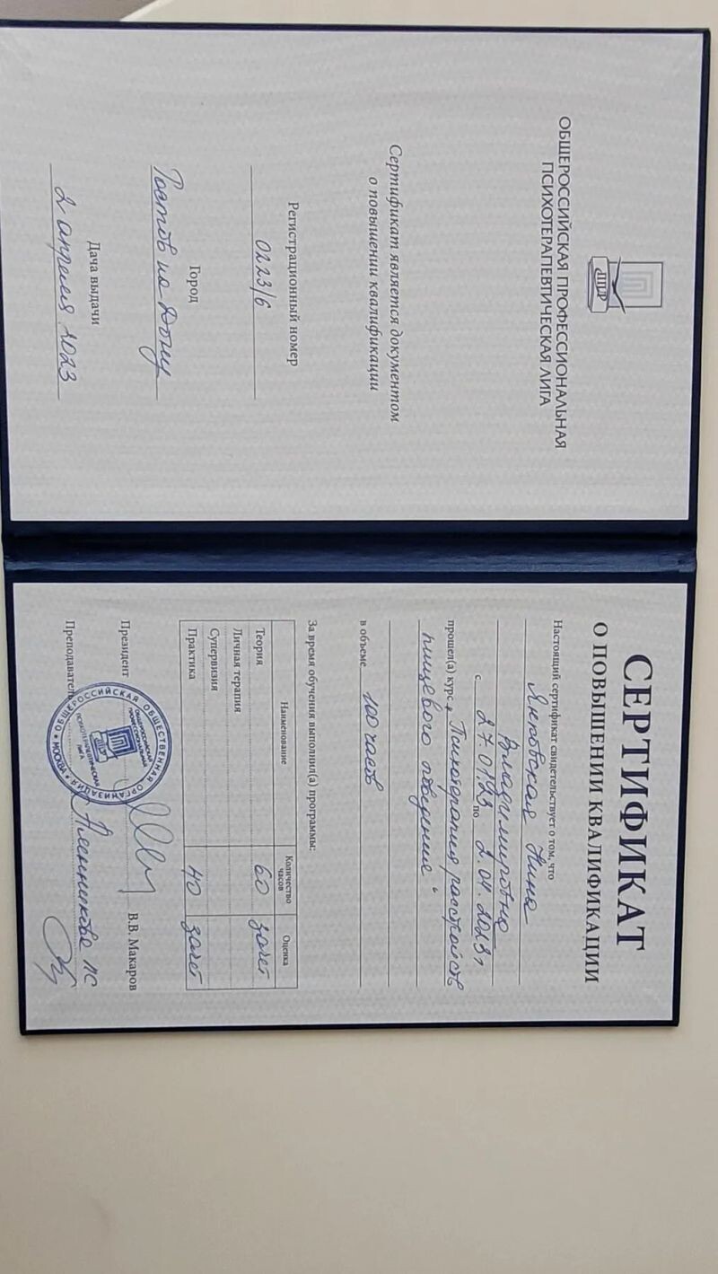 - Общероссийская профессиональная психотерапевтическая лига, повышения квалификации, курс «Психотерапия расстройств пищевого поведения», 2023 г.