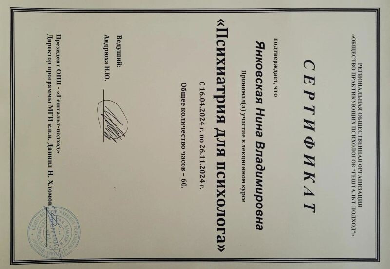 - ОПП «Гештальт-подход», психиатрия для психолога, 2024 г.