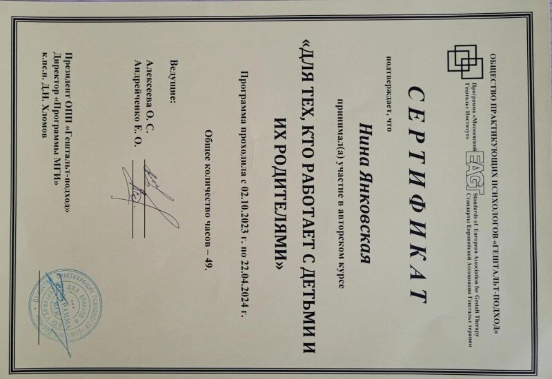 - ОПП «Гештальт-подход», МГИ, курс «Для тех, кто работает с детьми и их родителями», 2023–2024 гг.