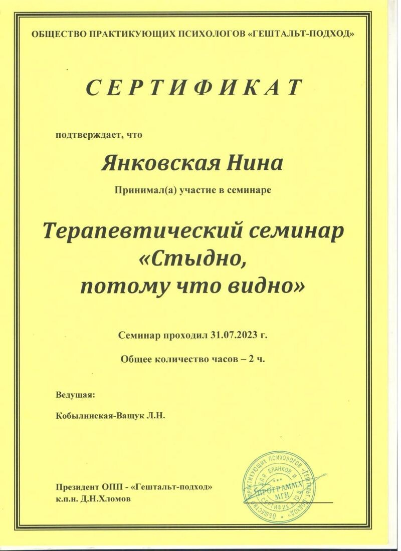 - Общество практикующих психологов «Гештальт-подход», семинар на тему «Стыдно, потому что видно», 2023 г.