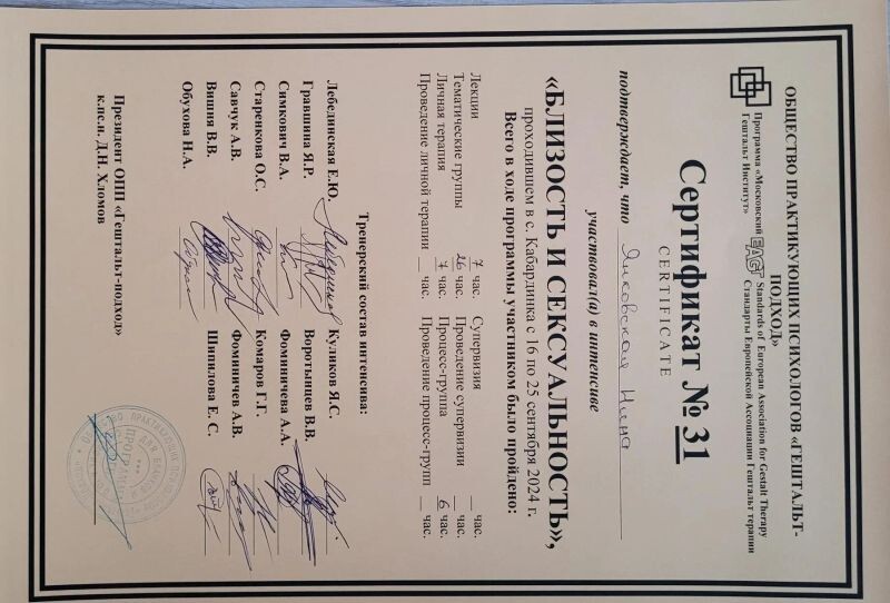 - ОПП «Гештальт-подход», МГИ, интенсив «Близость и сексуальность», 2024 г.