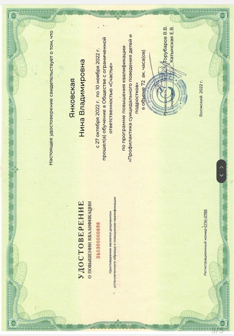- ООО «Счастье», повышение квалификации по программе «Профилактика суицидального поведения детей и подростков», 2022 г.