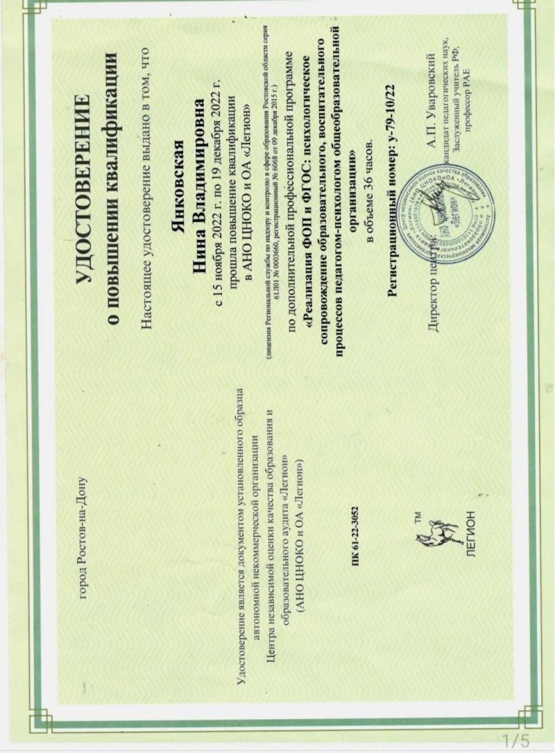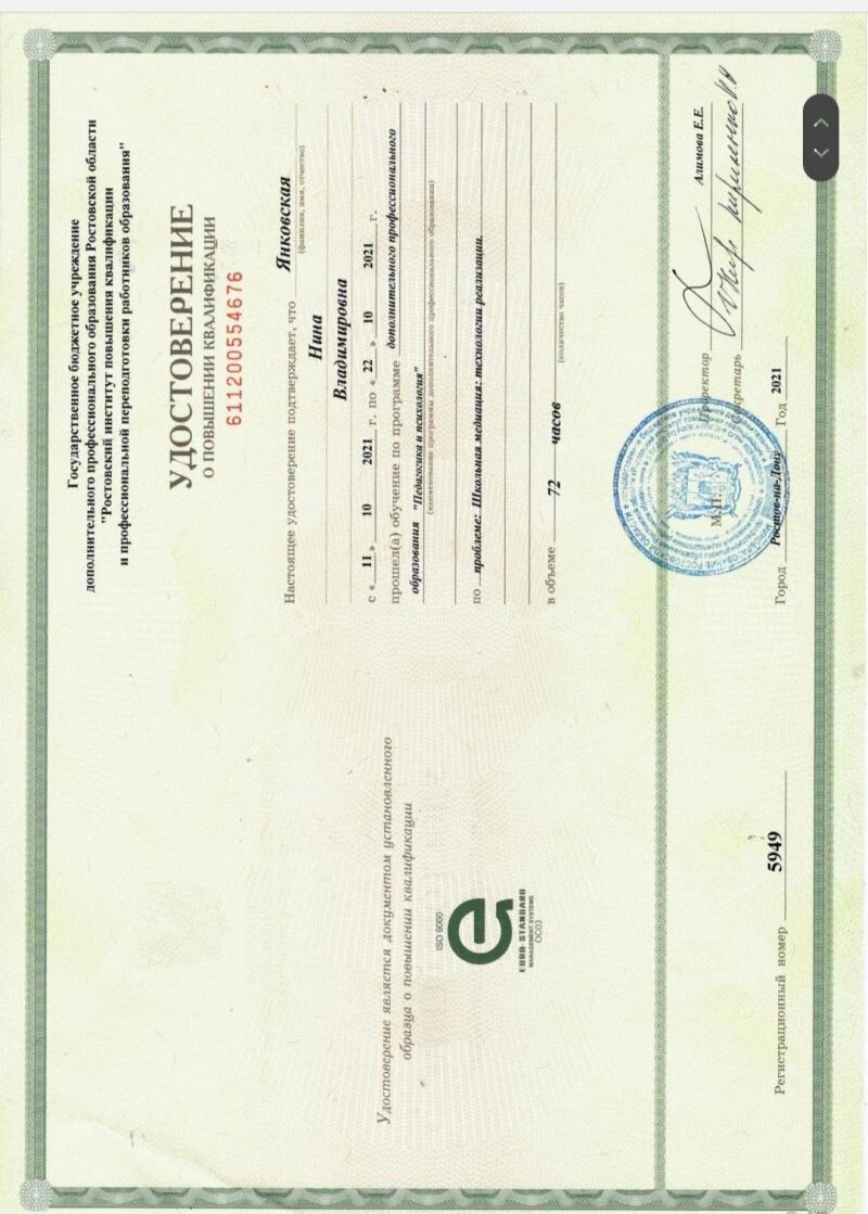 - ГБУ ДПО РО «Ростовский институт повышения квалификации и профессиональной переподготовки работников образования», педагогика и психология, 2021 г.