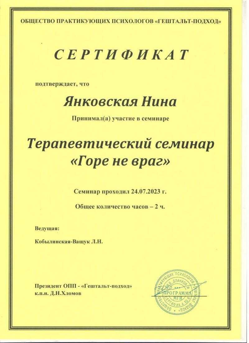 - ОПП «Гештальт-подход», семинар «Горе не враг», 2023 г.