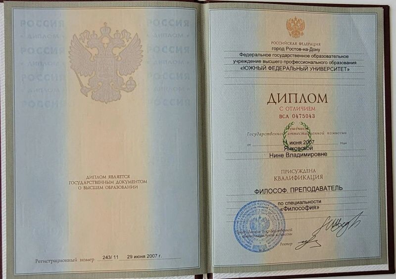 - Южный федеральный университет, философия, диплом с отличием, 2002–2007 гг.