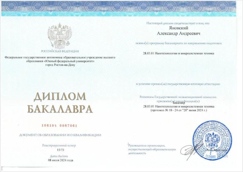 - Южный федеральный университет, физический факультет, нанотехнологии и микросистемная техника, 2020–2024 гг.