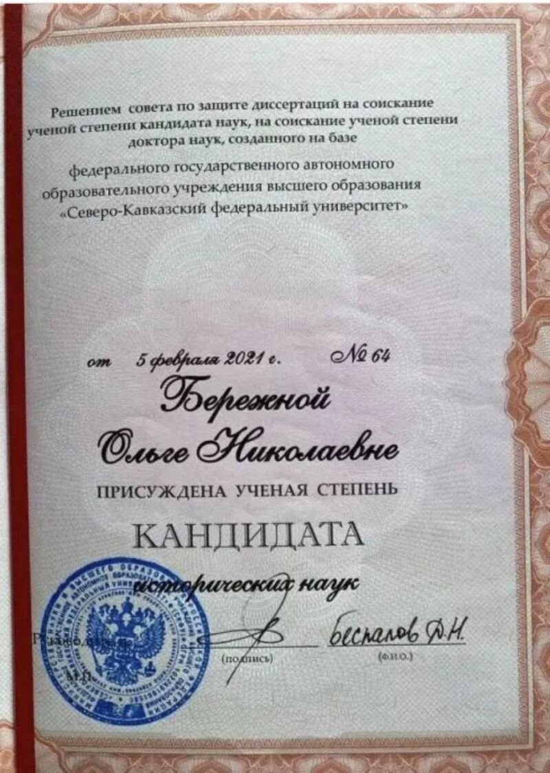- Северо-Кавказский федеральный университет, кандидат исторических наук, 2021 г.