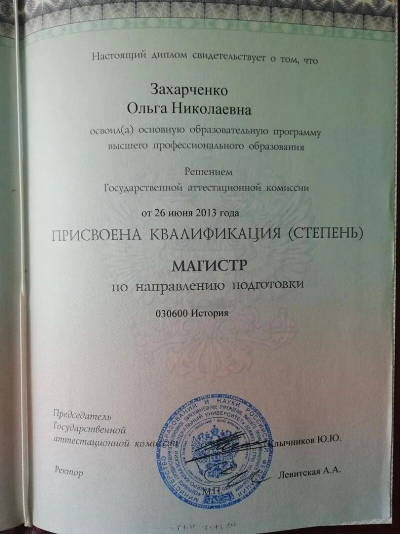 - Северо-Кавказский федеральный университет, факультет истории, философии и искусств, история, магистр, 2011–2013 гг.