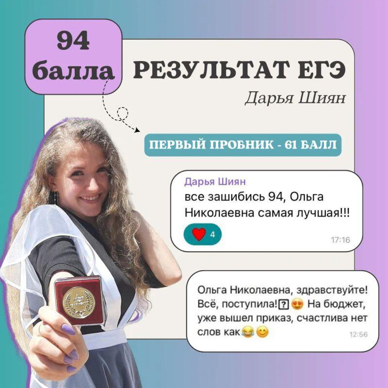 Плюсы: Занятия Ольгой Николаевной были очень интересными и плодотворными. Материал был легко усвоен и запомнен благодаря ее уникальному подходу. Занятия никогда не были скучными. Благодаря ее помощи я смогла сдать экзамен по обществознанию на отличный результат - 94 балла, несмотря на мой низкий уровень знаний.