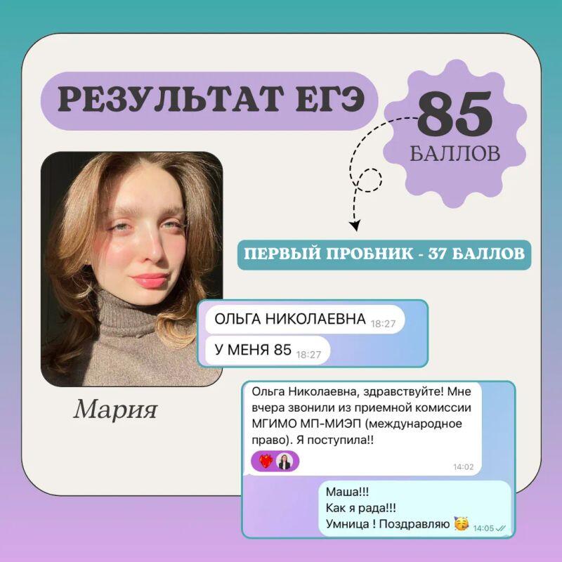 Описание: Я очень благодарна Ольге Николаевне за то, что смогла получить хорошую подготовку к экзамену по истории всего за один год. Уроки с ней были продуктивными и интересными.