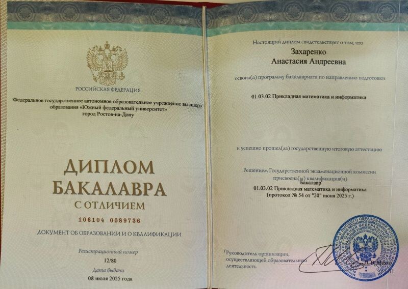 - Диплом бакалавра с отличием ФГАОУ ВО "Южный федеральный университет", Институт математики, механики и компьютерных наук имени И. И. Воровича по направлению: Прикладная математика и информатика (с 2025 г.).