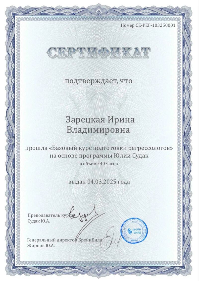 - ООО «Брейн Билд». Базовый курс подготовки регрессологов на основе программы Юлии Судак, 2025 г.