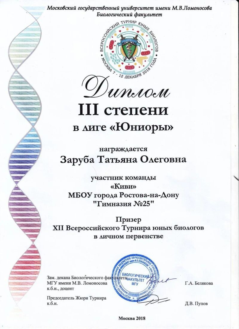 - Московский государственный университет имени М.В. Ломоносова, Призер Всероссийского турнира юных биологов, 2018 г.