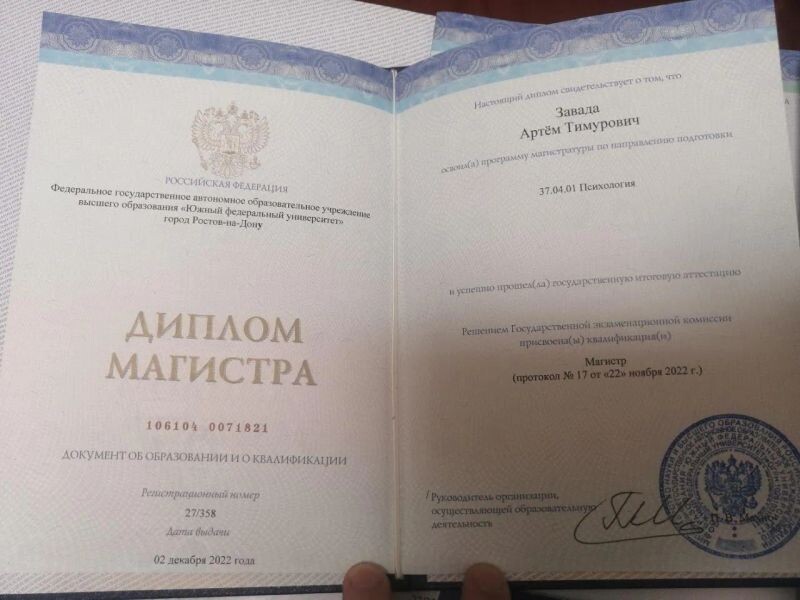 - Южный федеральный университет, специальность «психология», магистр, 2020–2022 гг.