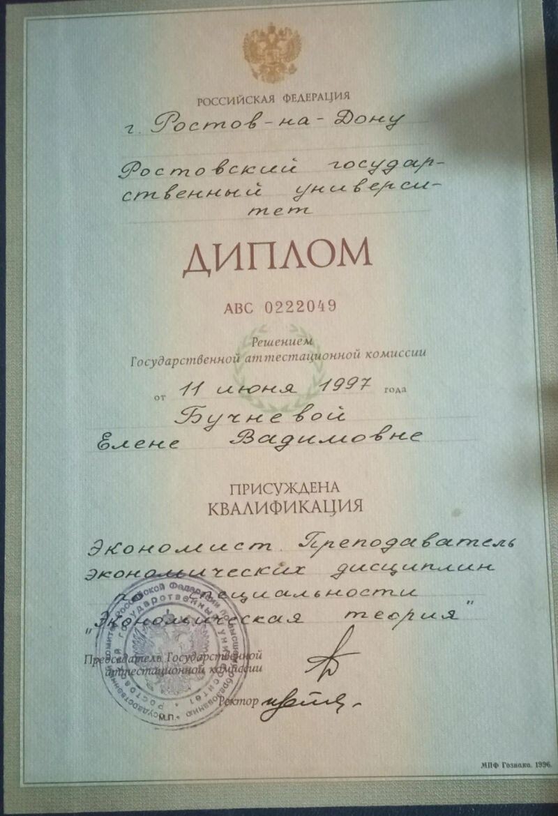 - Ростовский государственный университет, экономист, преподаватель экономических дисциплин, 1992–1997 гг.