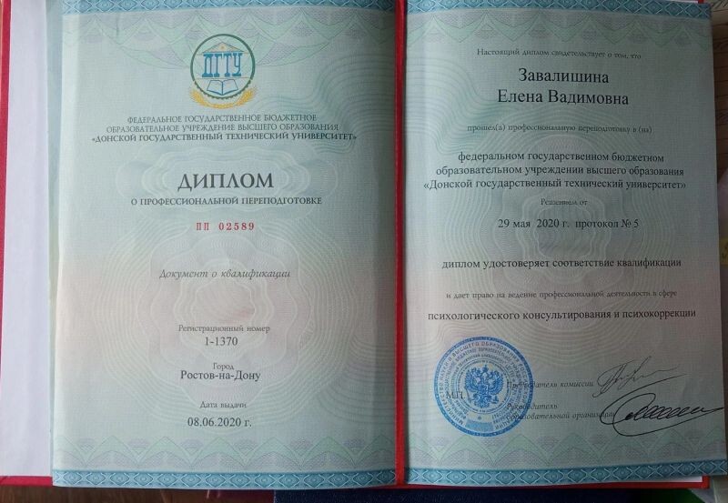 - Донской государственный технологический университет, психологическое консультирование и психокоррекции, 2019–2020 гг.