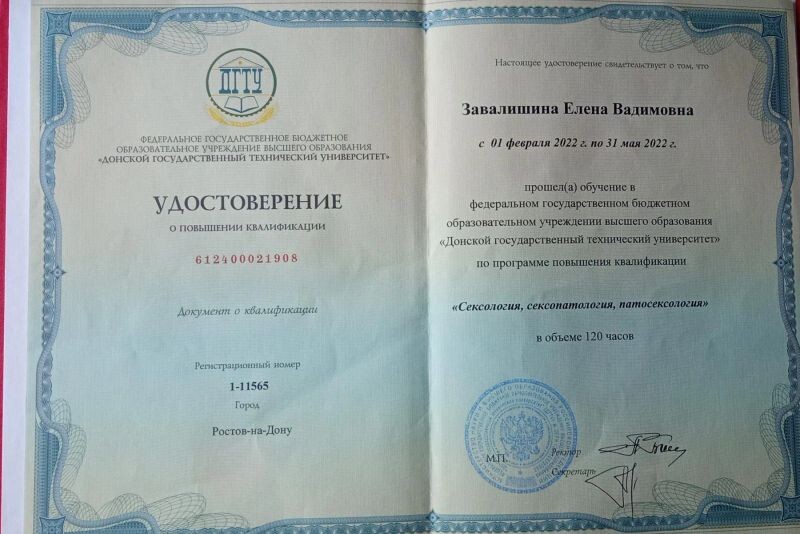 - ФГБОУ ВО «Донской государственный технический университет», программа «Сексология, сексопатология, патосексология», 2022 г.
