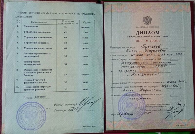 - Международный институт менеджмента ЛИНК, программа «Менеджмент», 2004–2005 гг.