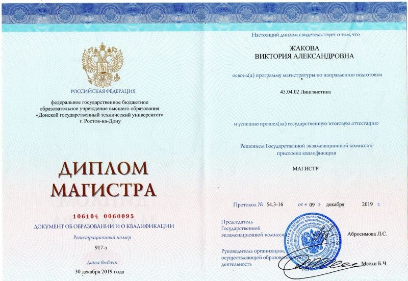 - Донской Государственный технический университет, Лингвистика, 2013–2019 гг.