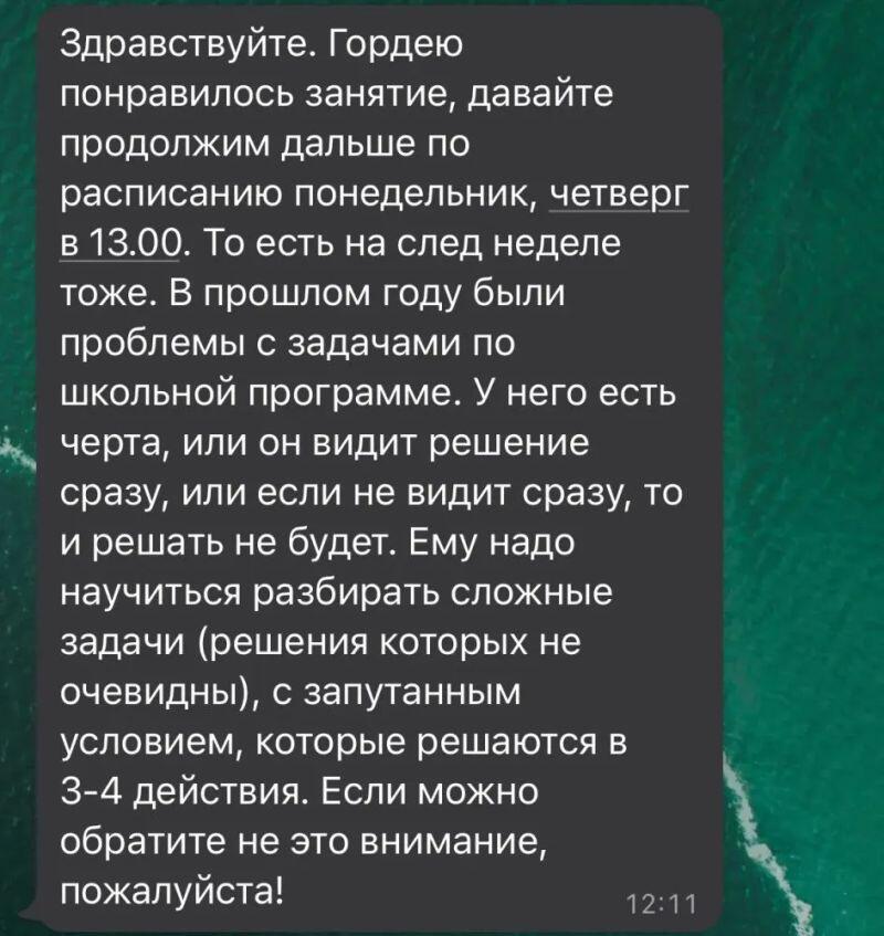 Мне и моему ребенку очень понравилось занятие. Преподаватель провел тестирование, чтобы определить уровень знаний и выявить пробелы. Мы договорились заниматься дважды в неделю и определили четкую задачу. Занятие было интересным и продуктивным.