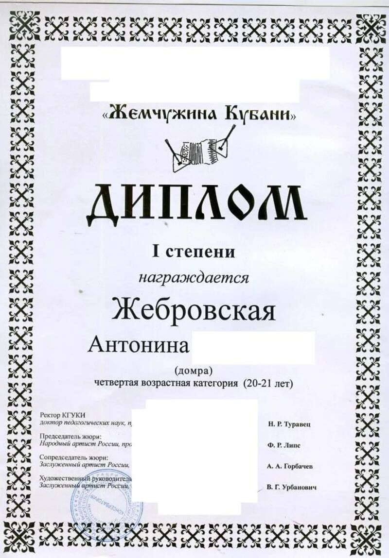 - Диплом о профессиональной переподготовке по программе «гитара: методика преподавания игры на инструменте» (2017 г.).